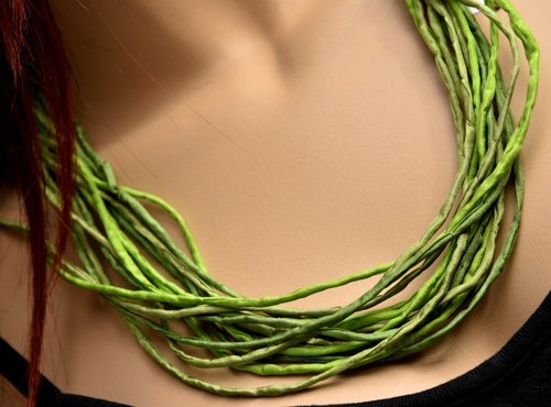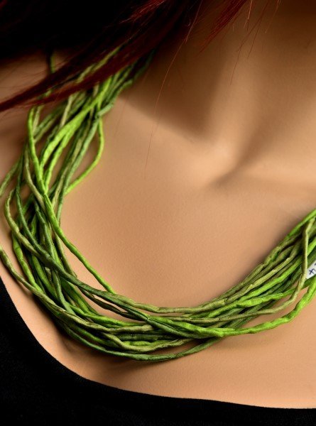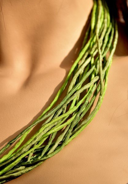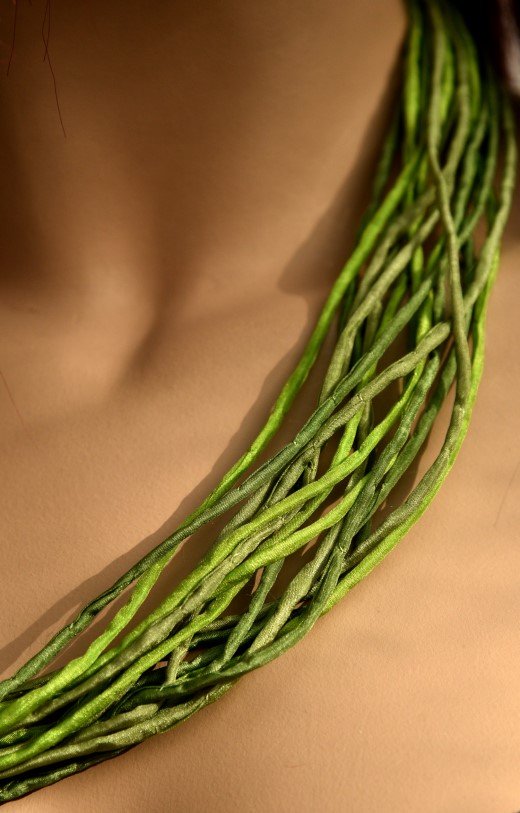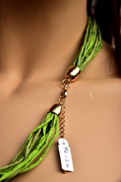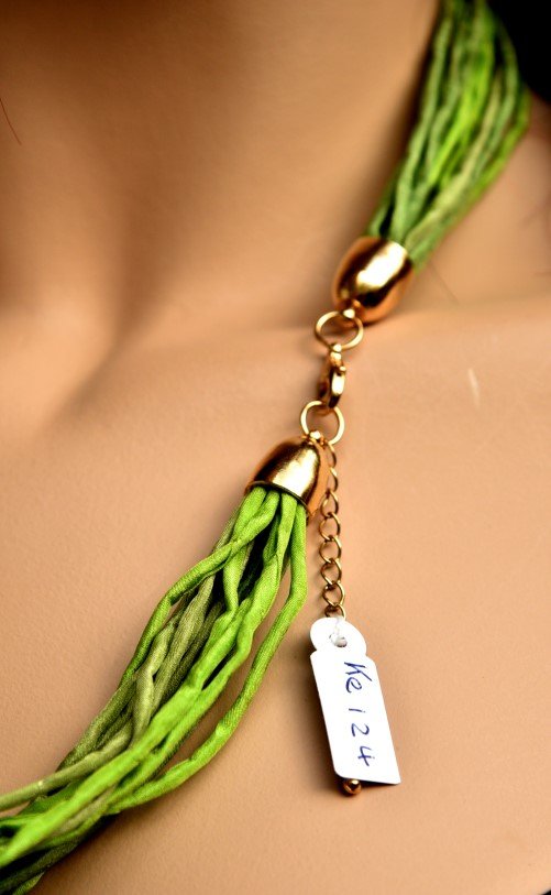 Echte handgeschilderde zijden ketting van 60 cm lang in groentinten: brons, veronese en angelique. Goudkleurige sluiting.