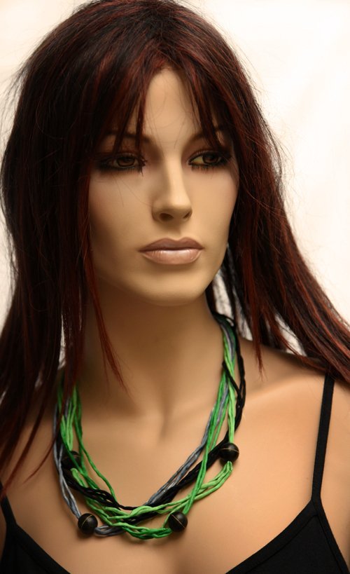 Licht en donkergroen met zwart en platinagrijs handgeschilderde zijden ketting en zwarte grote kralen, zwarte sluiting, 60 cm omtrek. Wil je andere kleuren? Mail me je specifieke wensen. Je kunt me appen of mailen. Stuur me een foto van je kleding waar het bij moet passen... of een stukje stof of een kleurstaaltje uit de bouwmarkt. Dan komt het vanzelf voor elkaar..... nou... bijna dan.... lol