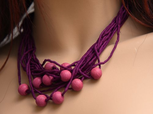 Echte handgeschilderde zijden ketting, paars met lichtpaarse houten kralen