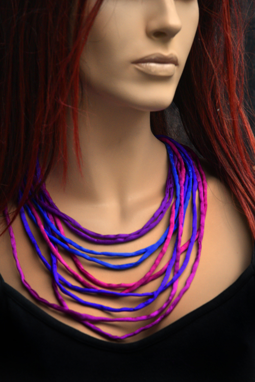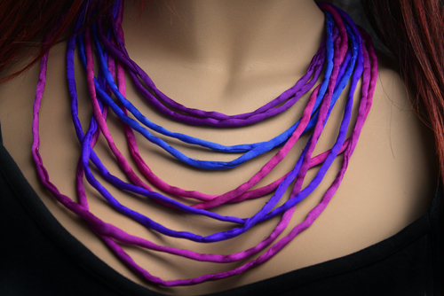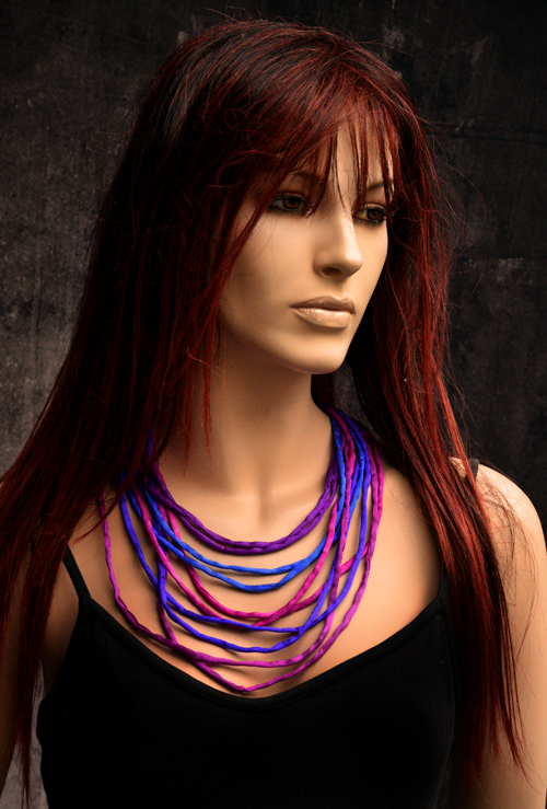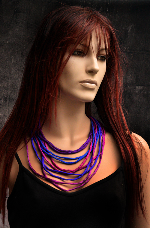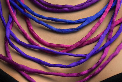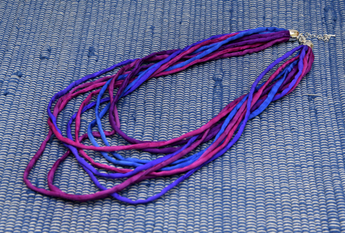 Handgeschilderde zijden ketting in de kleuren blauw, paars en fuchsia, met dikkere draadjes van crêpe satin zijde
