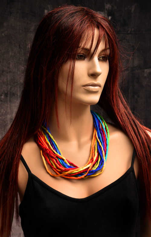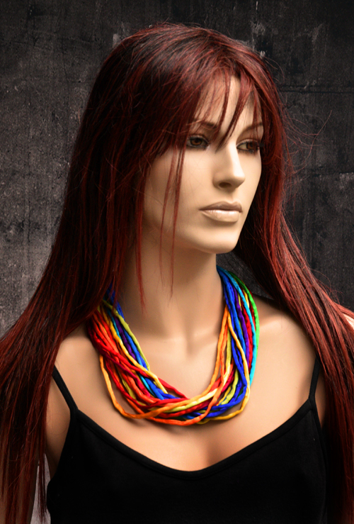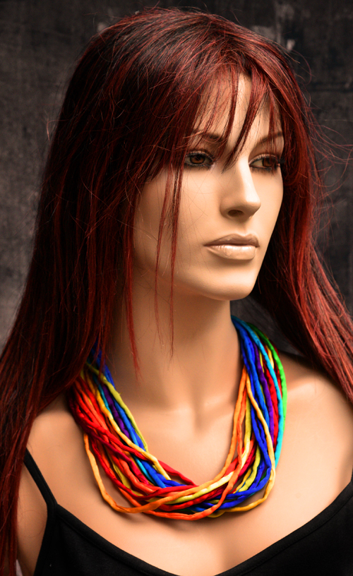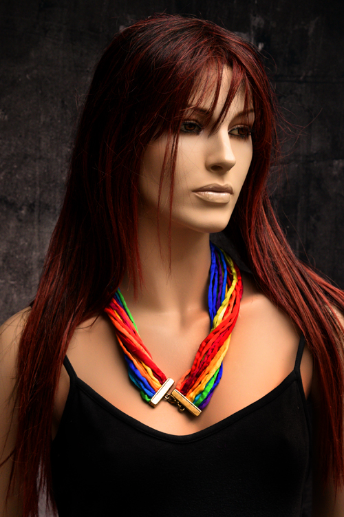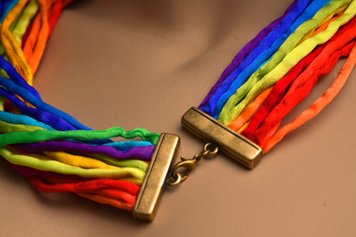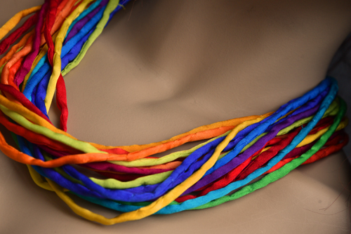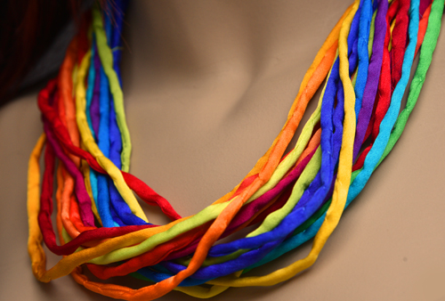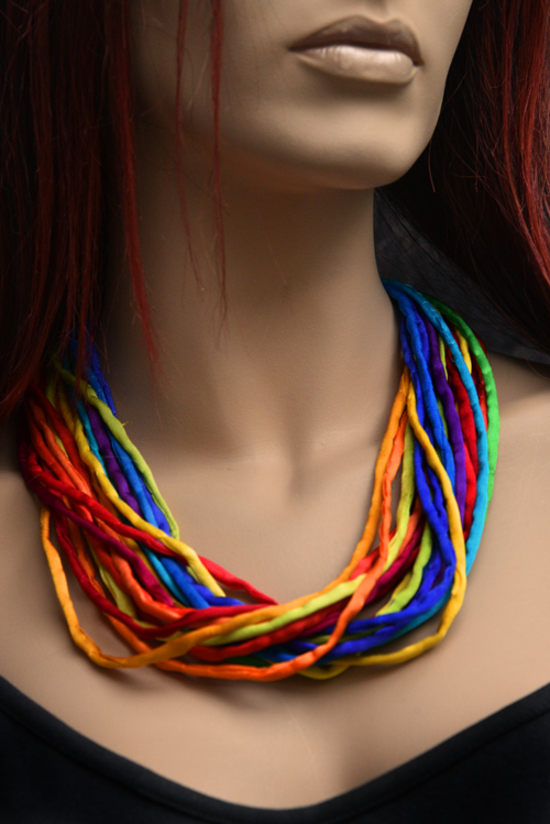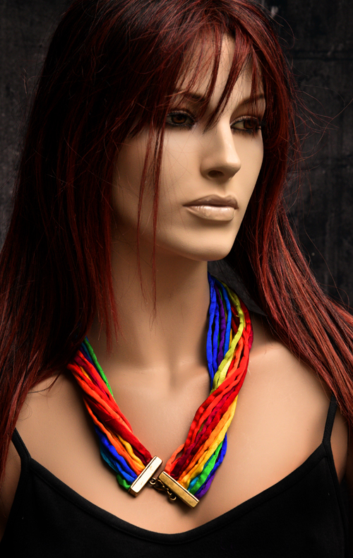 Zijden ketting met de kleuren van de regenboog in crêpe satin zijde met een bijzondere koperen sluiting