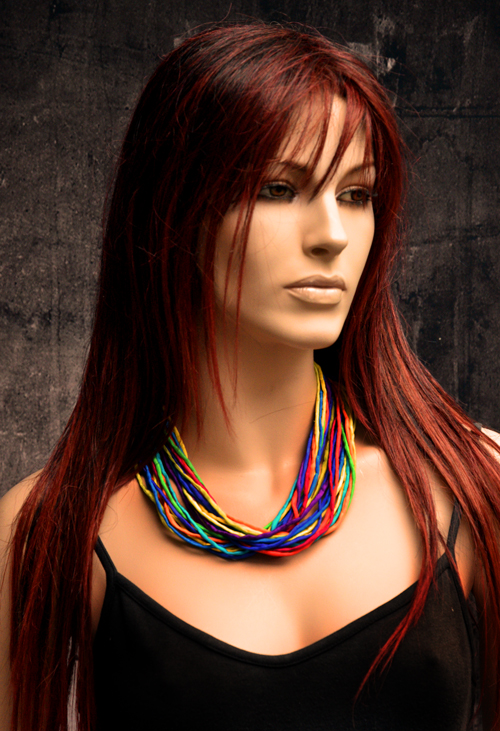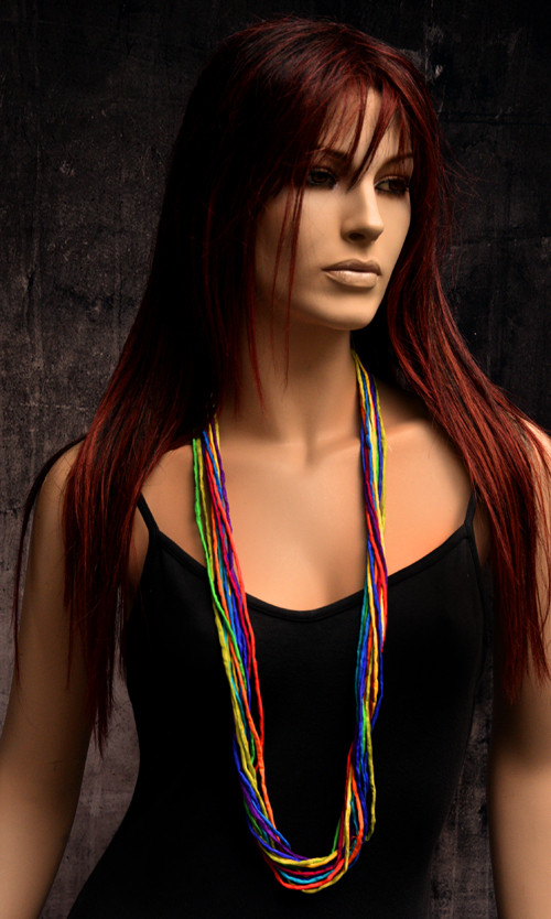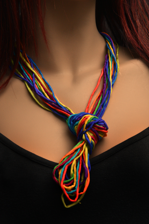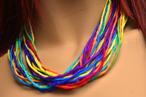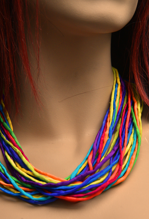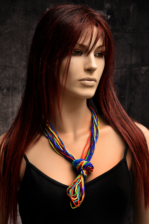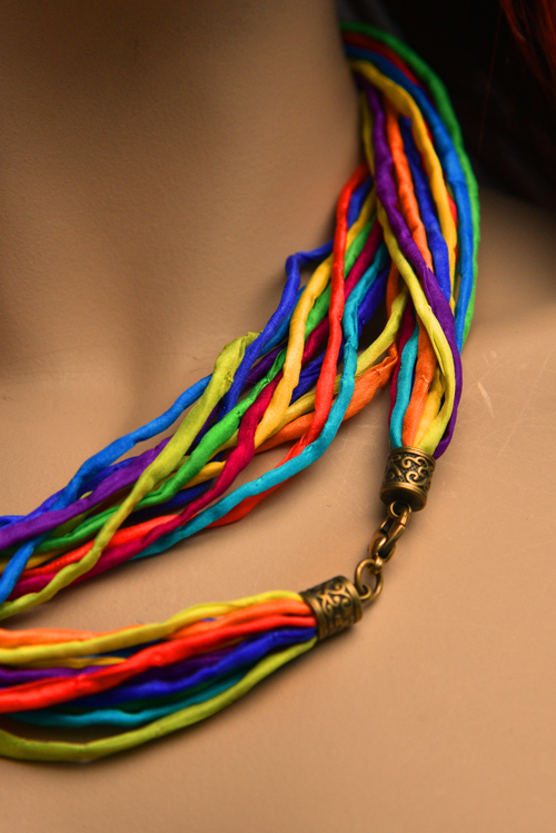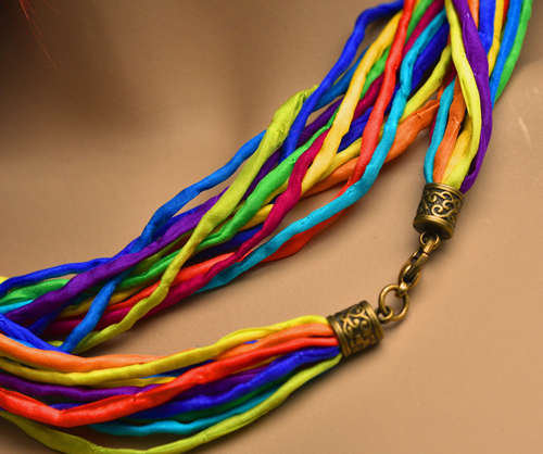 Zijden ketting met de kleuren van de regenboog in pongee zijde met een koperen sluiting